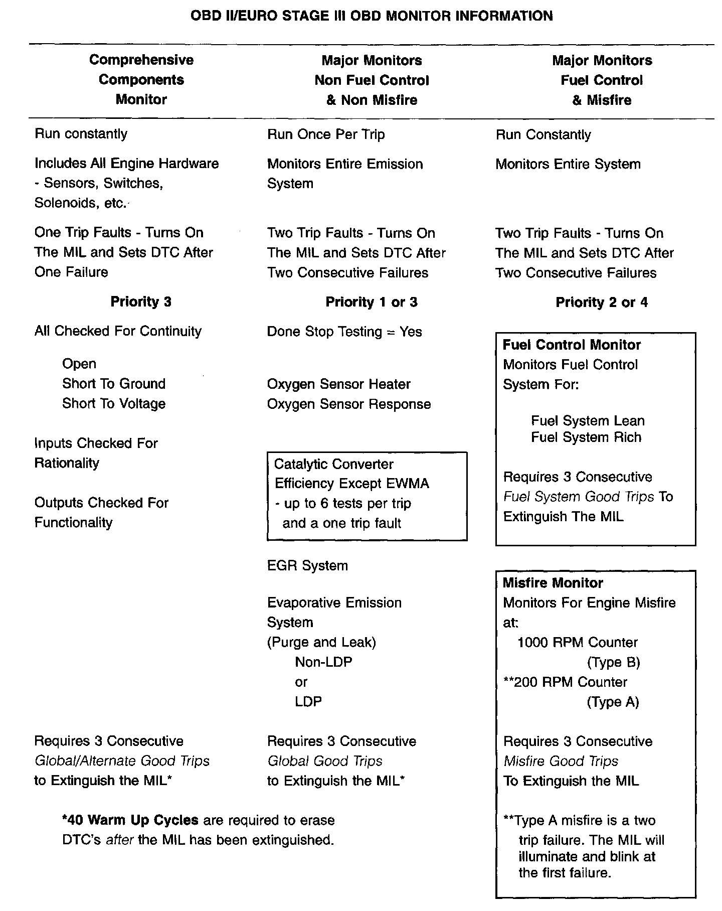 The following table summarizes the various OBDII/Euro Stage III OBD monitors operation.