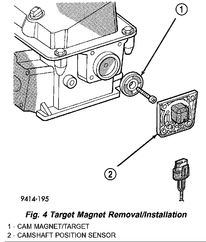 4. Remove camshaft position sensor mounting screws. Remove sensor.