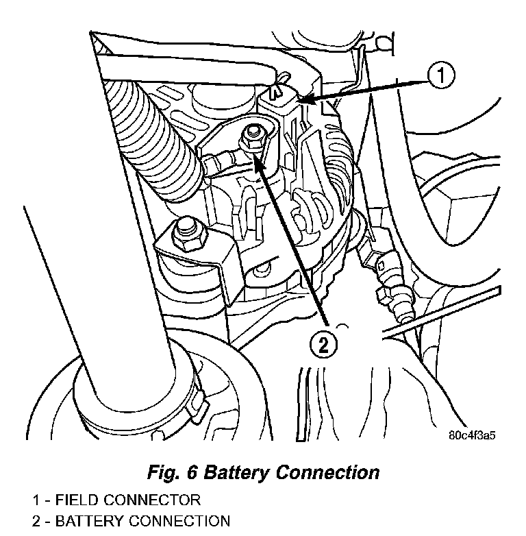 8. Install the B+ terminal nut and wire and tighten (Fig. 5) to 11.3 Nm (100 ins. lbs.).