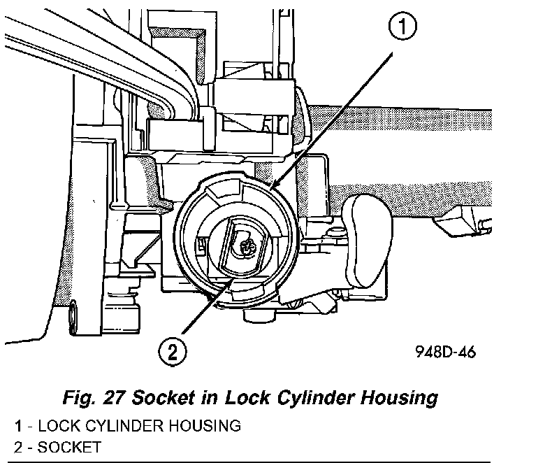 The lock cylinder is inserted in the end of the housing opposite the ignition switch. The ignition key rotates the cylinder to 5 different detents (Fig. 26):