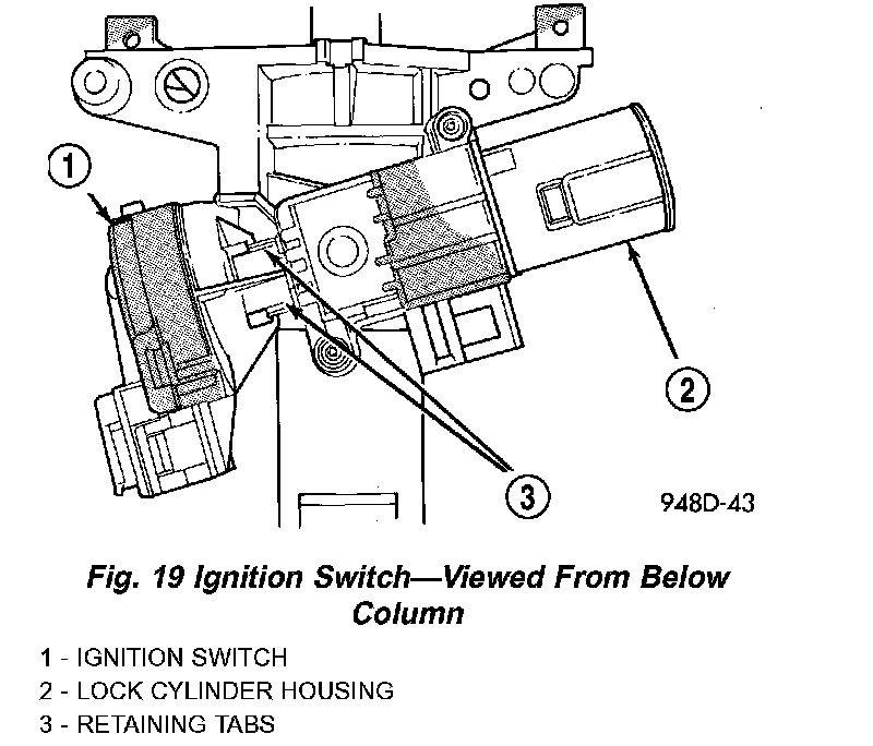 The ignition switch attaches to the lock cylinder housing on the end opposite the lock cylinder (Fig. 19). For ignition switch terminal and circuit identification, refer to the Wiring Diagrams sections.