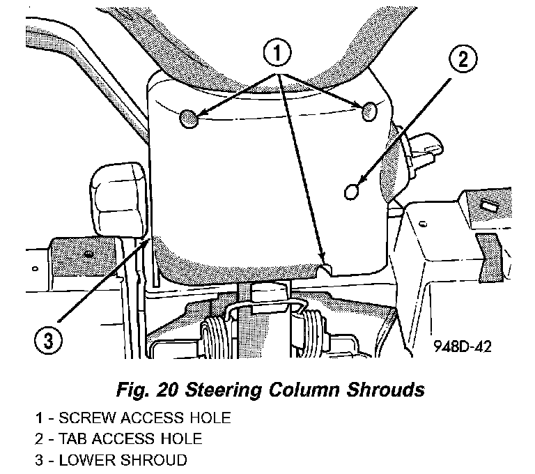 3. Place key cylinder in RUN position. Through the hole in the lower shroud, depress lock cylinder retaining tab and remove key cylinder (Fig. 20).