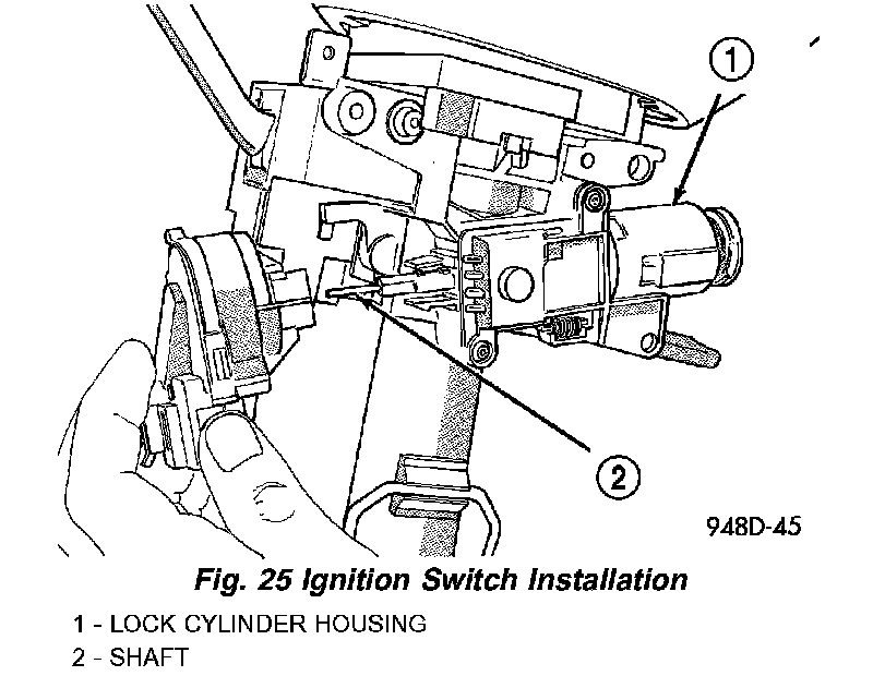 2. Carefully install the ignition switch. The switch will snap over the retaining tabs (Fig. 25). Install mounting screw (Fig. 23).