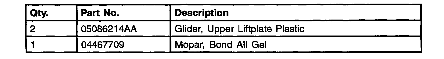 6. Replace the glider with the revised glider, p/n 05086214AA, ensuring that it is fully bottomed out to the liftplate. Secure with Mopar Bond All Gel, p/n 4467709, (instantaneous bond).