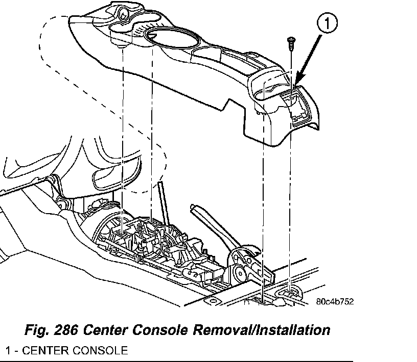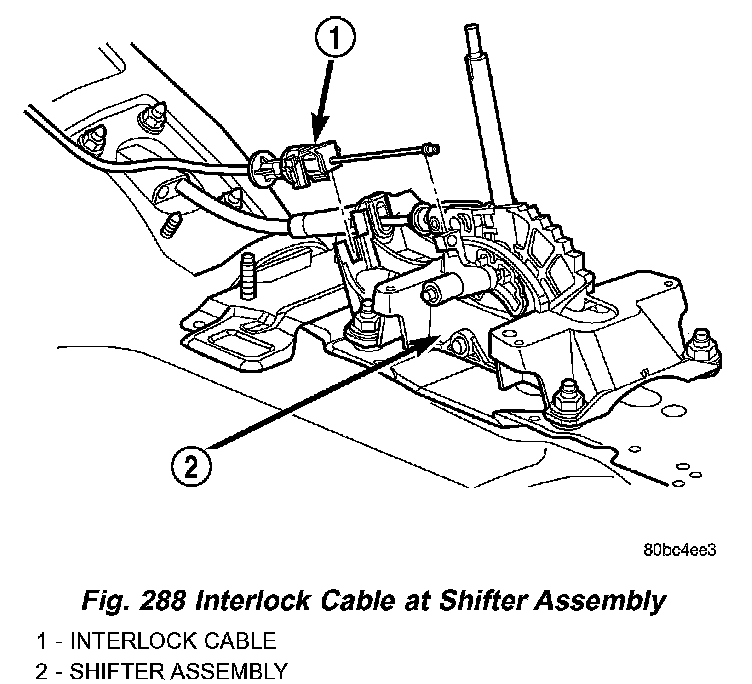 5. Disconnect the shifter/ignition interlock cable from the shifter lever and bracket as shown in (Fig. 288). Remove the cable core end from the plastic cam of the shifter mechanism and release cable from shifter bracket