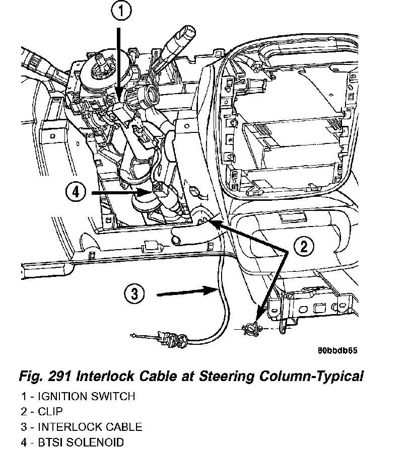 8. Disconnect the Brake/Transmission Shift Interlock (BTSI) solenoid connector from the interlock cable (Fig. 291).
