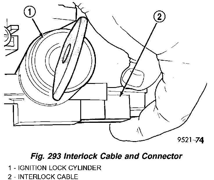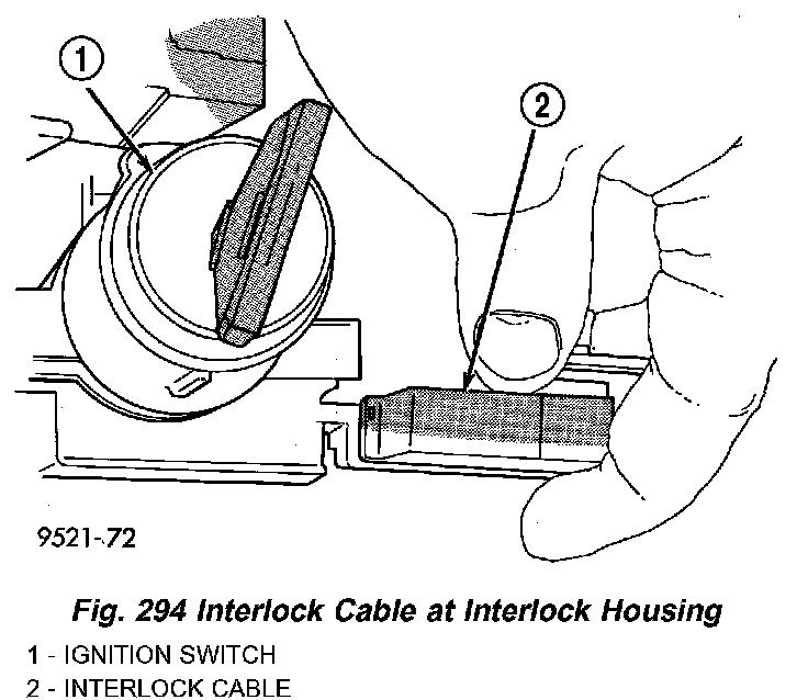 3. Install the interlock cable into the interlock housing at the steering column (Fig. 294). Verify the cable snaps into the housing and is fully seated.