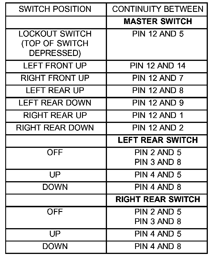 Remove the switch. Using an ohmmeter, test the window switch for continuity in all positions listed in the Continuity Table. Refer to the Power Window Switch Continuity table to determine if continuity is correct and.