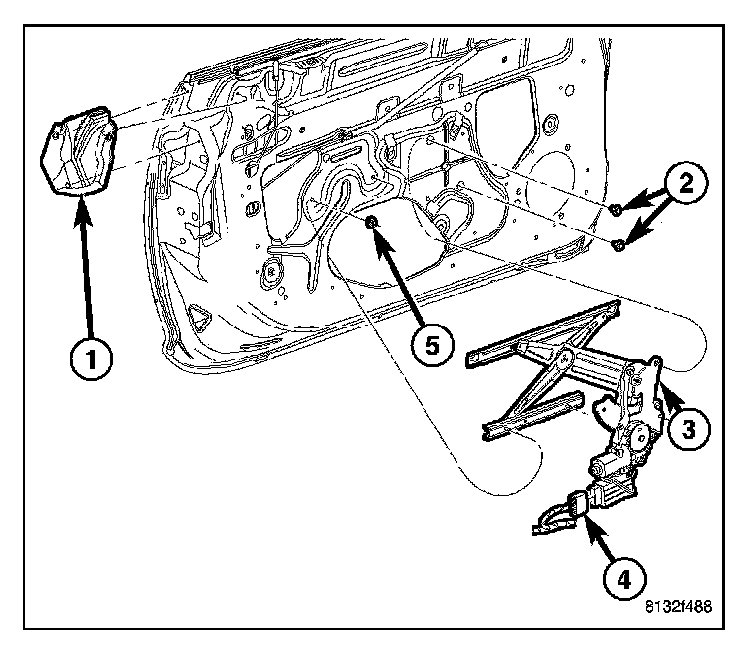3. Remove nuts (5) attaching regulator lift channel to door glass.