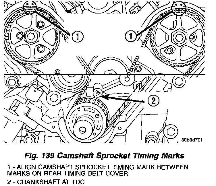 7. Install camshaft sprockets onto the camshafts. Install NEW sprocket attaching bolts into place. The 255 mm (10 in.) bolt is to be installed in the left camshaft and the 213 mm (8-3/8 in.) bolt is to be installed into the right camshaft. Do not tighten the bolts. Camshaft sprocket mark should be positioned between the marks on the inner cover (Fig. 139).