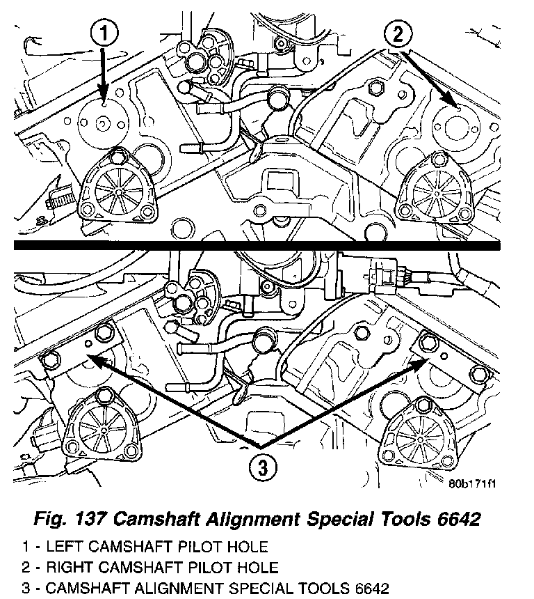 3. Install the camshaft alignment Special Tools 6642 to the rear of each cylinder head (Fig. 137).