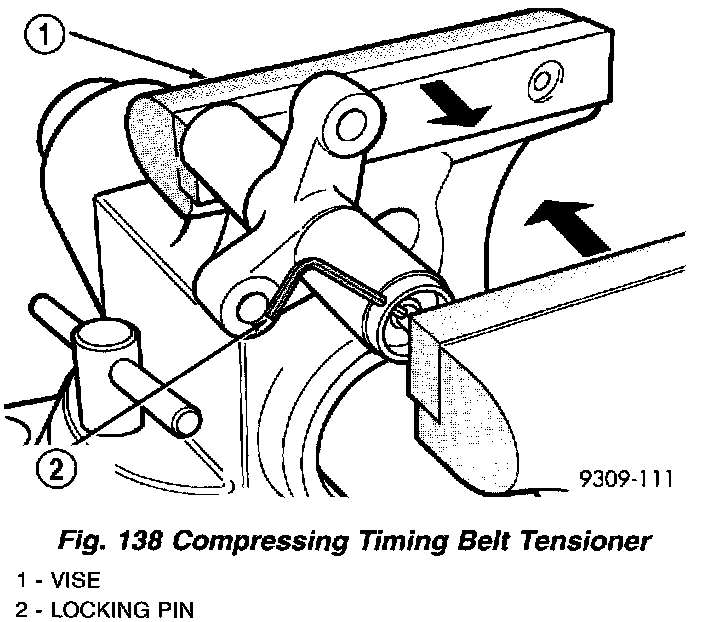 5. Place the tensioner into a vise and SLOWLY compress the plunger into the tensioner (Fig. 138). Total bleed down of tensioner should take about 5 minutes.