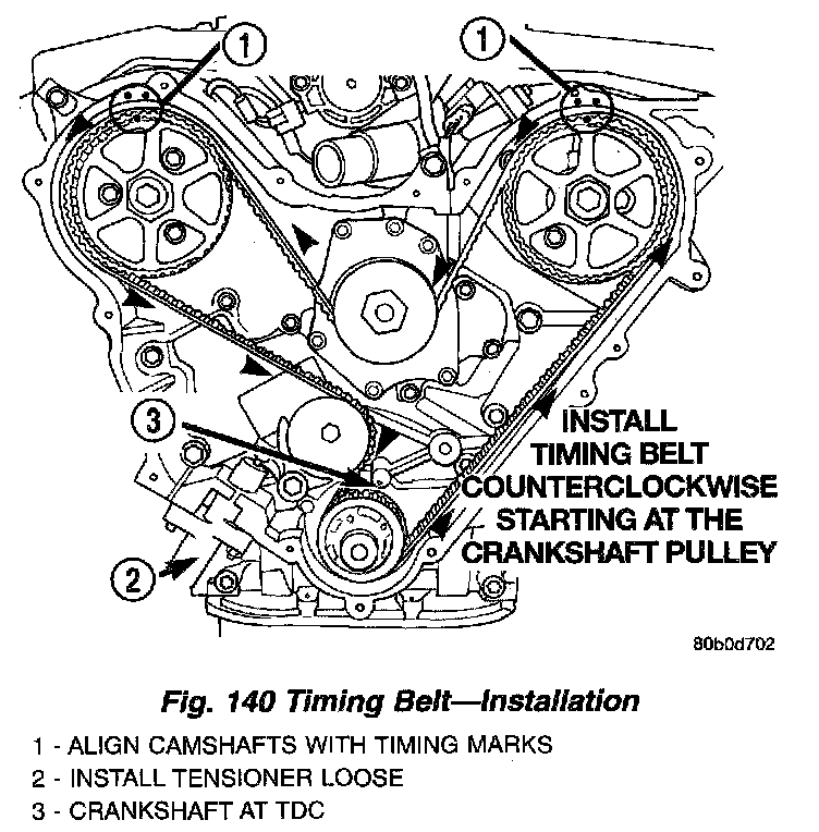 8. Install the timing belt starting at the crankshaft sprocket going in a counterclockwise direction (Fig. 140). Install the belt around the last sprocket. Maintain tension on the belt as it is positioned around the tensioner pulley. Each camshaft sprocket mark should still fall between the cover marks.