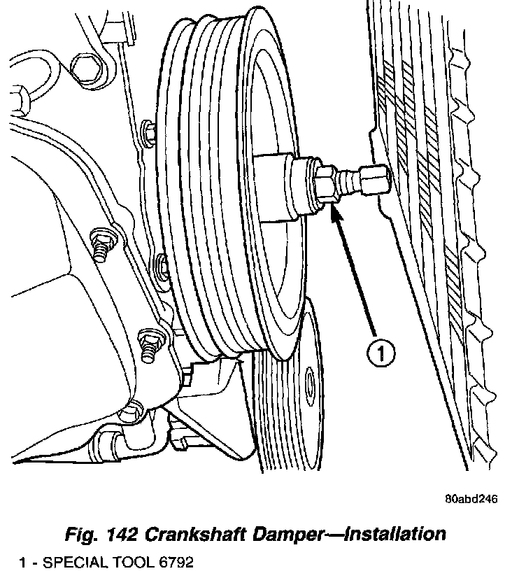 15. Install crankshaft damper (Fig. 142).