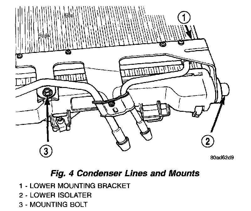 7. Lift radiator out of lower mounting brackets. Condenser lower mounting bracket is trapped between the radiator lower isolator and plastic radiator tank pin. It is necessary to lift radiator and push down on condenser to free condenser bracket from radiator pins.