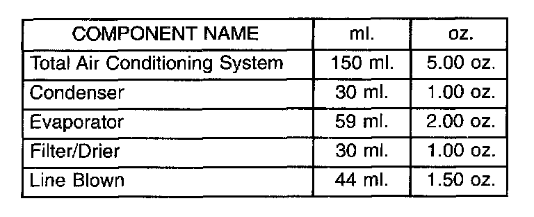 When an air conditioning system is first assembled, all components (except the compressor) are refrigerant oil free. After the system has been charged with (R-134a) refrigerant and operated, the oil in the compressor is dispersed through the lines and components. The evaporator, condenser, and receiver/drier will retain a significant amount of oil. Refer to the A/C Component Refrigerant Oil Capacities Chart below. When a component is replaced, the specified amount of refrigerant oil must be added. When the compressor is replaced, the amount of oil that is retained in the rest of the system must be drained from the replacement compressor. When a line or component has ruptured and oil has escaped, the compressor should be removed and drained. The receiver/drier must be replaced along with the ruptured part. The oil capacity of the system, minus the amount of oil still in the remaining components, can be measured and poured into the suction port of the compressor.