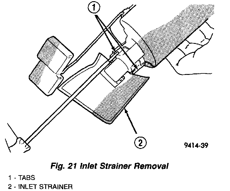 2. Using a thin straight blade screwdriver, carefully pry back the locking tabs on fuel pump reservoir and remove the strainer (Fig. 21).