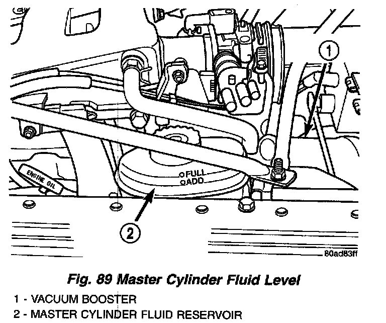 The brake fluid reservoir is marked on both sides with a MAX fill line for the brake fluid level. Proper fill level of the fluid reservoir is to the center of the MAX fill line on reservoir.