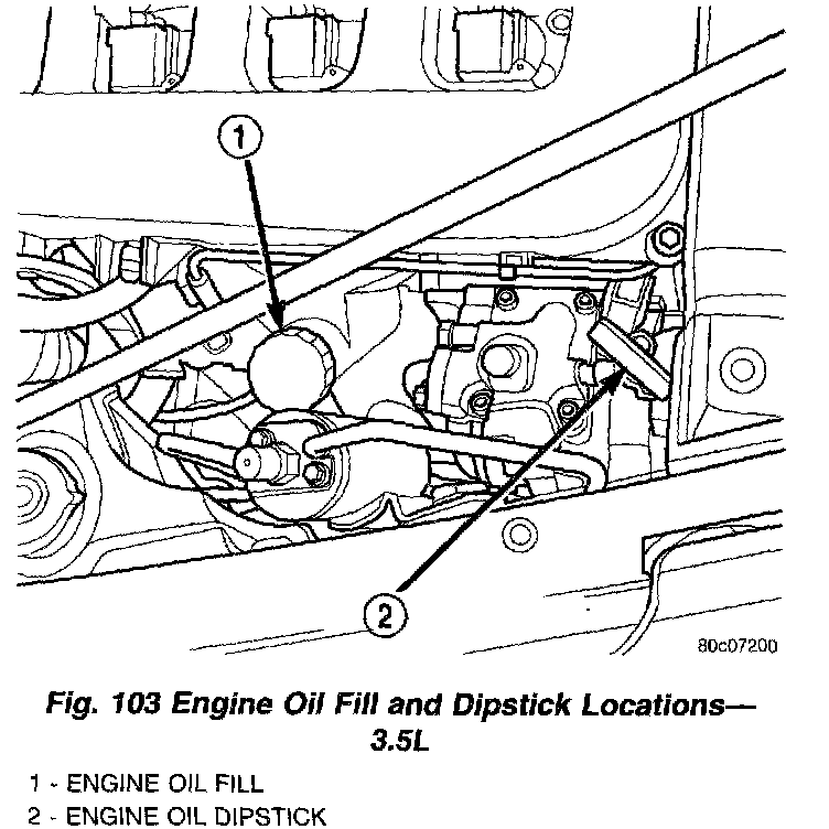 Checking the oil while the vehicle is on level ground will improve the accuracy of the oil level reading (Fig. 103). Add only when the level is at or below the ADD mark.