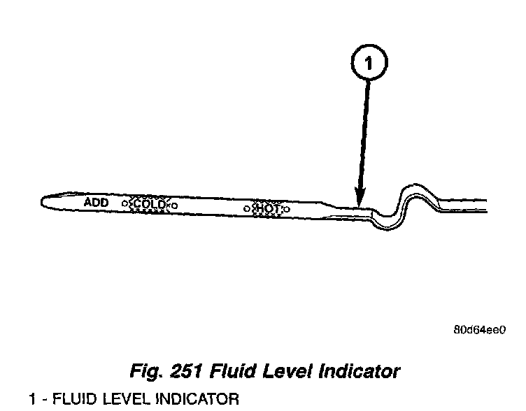 The torque converter fills in both the P Park and N Neutral positions. Place the selector lever in P Park to be sure that the fluid level check is accurate. The engine should be running at idle speed for at least one minute, with the vehicle on level ground. At normal operating temperature (approximately 82°C. or 180°F.), the fluid level is correct if it is in the HOT region (cross-hatched area) on the oil level indicator (Fig. 251). The fluid level should be in COLD region at 80° F fluid temperature. Adjust fluid level as necessary. Use only Mopar ATF +4.