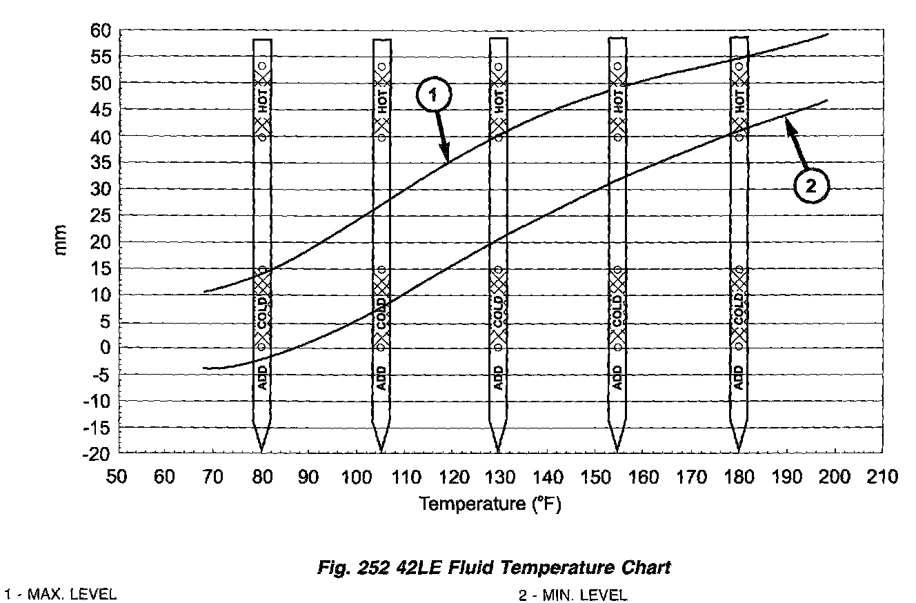 6. Adjust transmission fluid level shown on the dipstick according to the chart (Fig. 252). Use only Mopar ATF +4 Automatic Transmission Fluid (MS 9602).