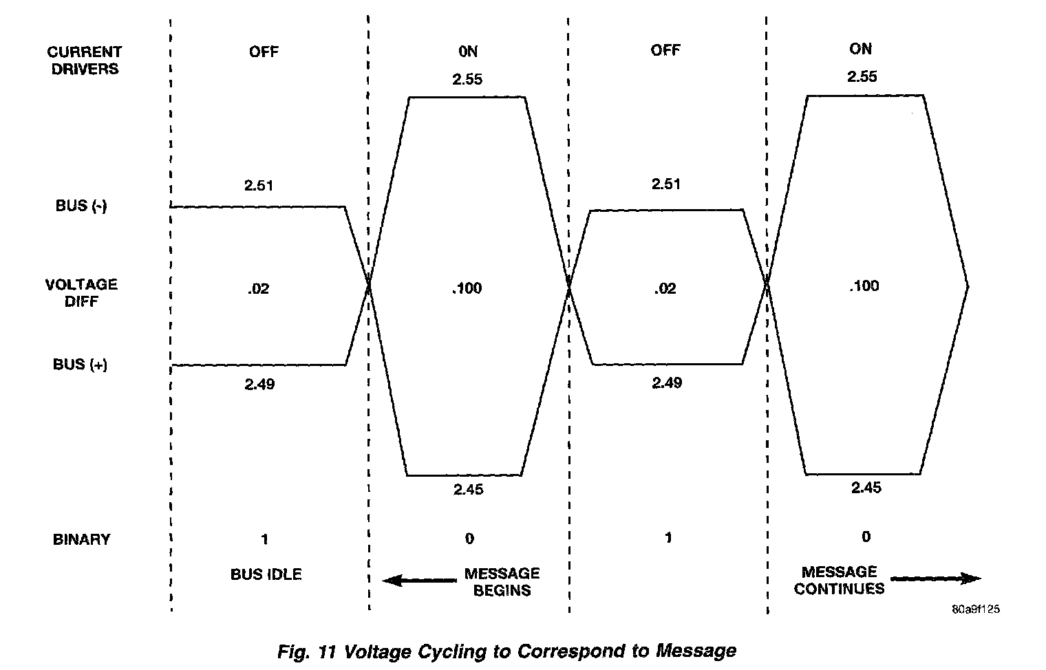 When the microprocessor signals the transceiver in the CCD chip to broadcast a message, the transceiver turns the current drivers ON and OFF, which cycles the voltage on the CCD data bus circuits to correspond to the message. At idle, the CCD system recognizes the 0.02 voltage differential as a binary bit 1. When the current drivers are actuated, the voltage differential from idle must increase by 0.02 volt for the CCD system to recognize a binary bit 0. The nominal voltage differential for a 0 bit is 0.100 volts. However, data bus voltage differentials can range anywhere between 0.02 and 0.120 volt.