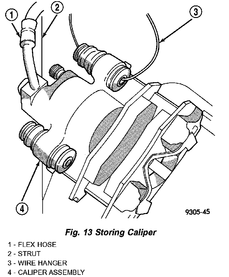 5. Support caliper from rear strut to prevent weight of caliper from damaging the flexible brake hose.