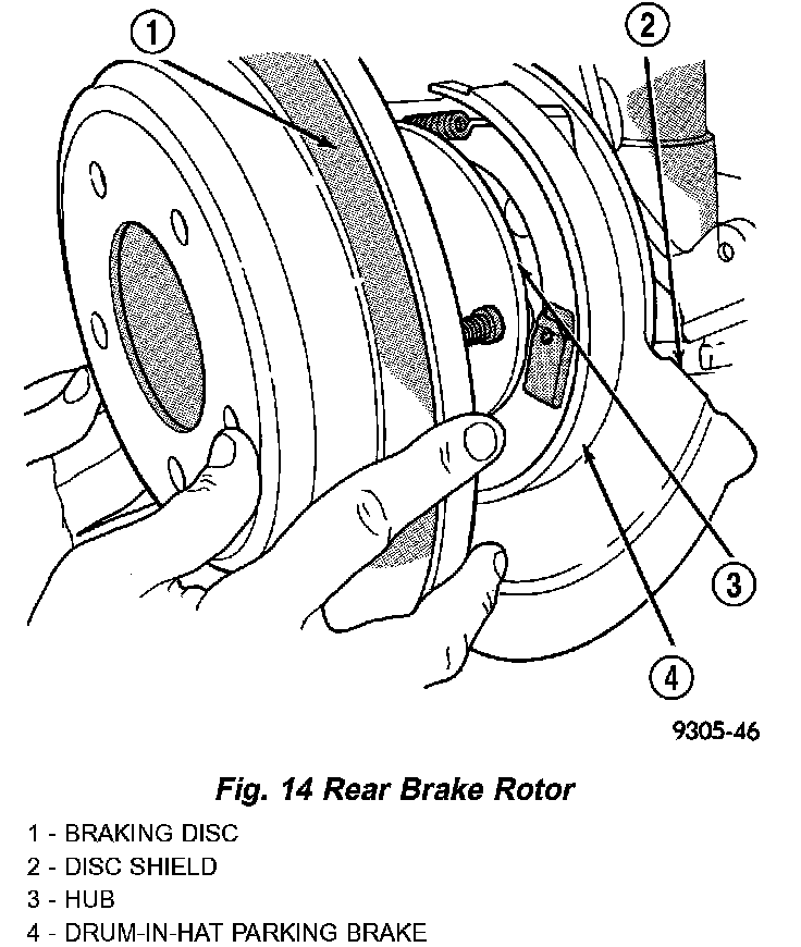 6. Remove rear rotor from hub/bearing. Then inspect drum-in-hat parking brake shoes and parking brake braking surface on rotor for any signs of excessive wear or damage. Replace parking brake shoes if required.