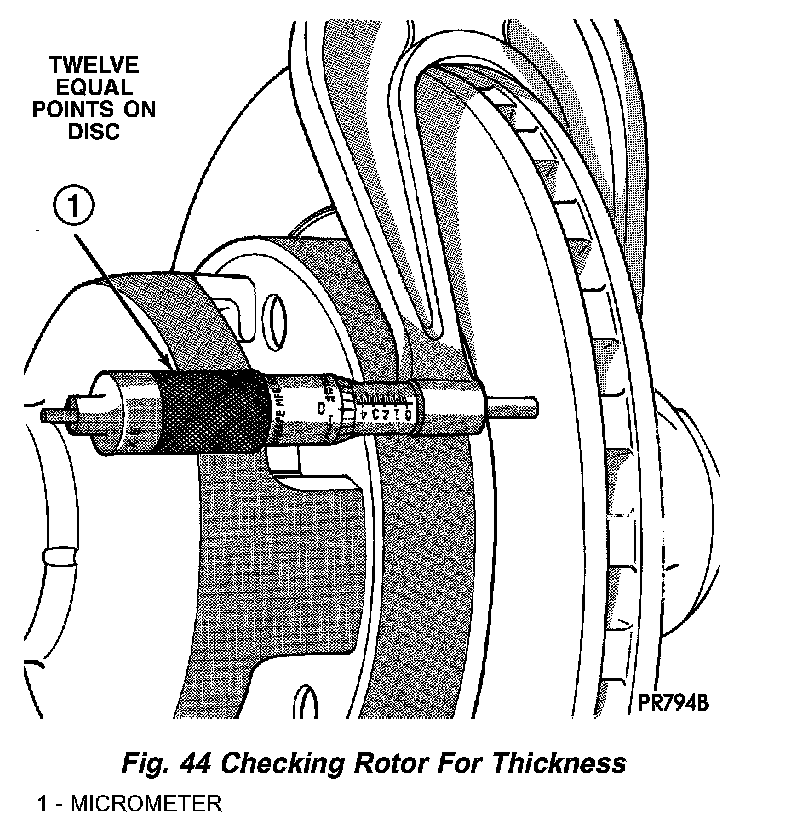 Rotor thickness variation measurements should be made in conjunction with measuring runout. Measure thickness of the brake rotor at 12 equal points around the rotor braking surface with a micrometer at a radius approximately 25 mm (1 inch) from edge of rotor. If thickness measurements vary by more than 0.013 mm (0.0005 inch), the rotor should refaced or replaced.