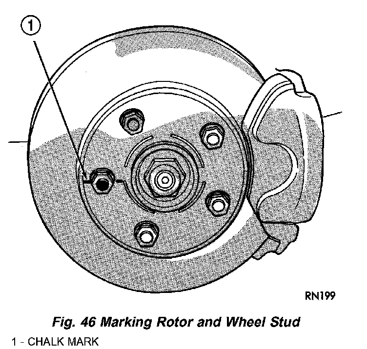 If runout is in excess of the specification, check the lateral runout of the hub face. Before removing the rotor from the hub, place a chalk mark across both the rotor and the one wheel stud closest to where the high runout measurement was taken. This way, the original mounting spot of the rotor on the hub is indexed.