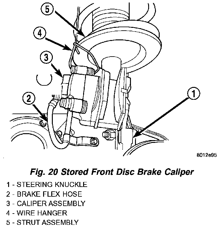 7. Using wire or cord, hang the caliper from the front strut assembly. Support the caliper firmly to prevent weight of caliper from being supported by the brake fluid hose.