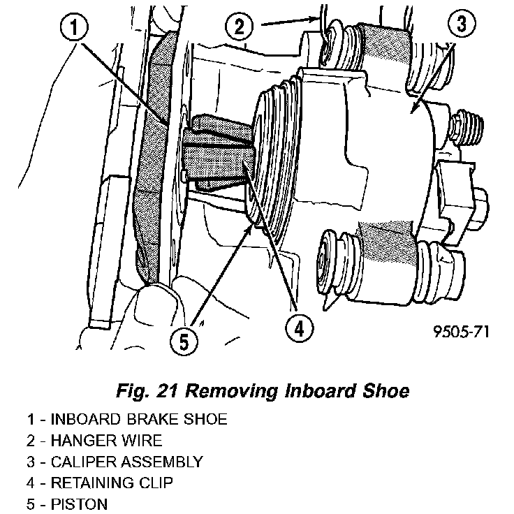 9. Pull the inboard brake shoe away from the caliper piston until the retaining clip on shoe is free from the cavity in the caliper piston .