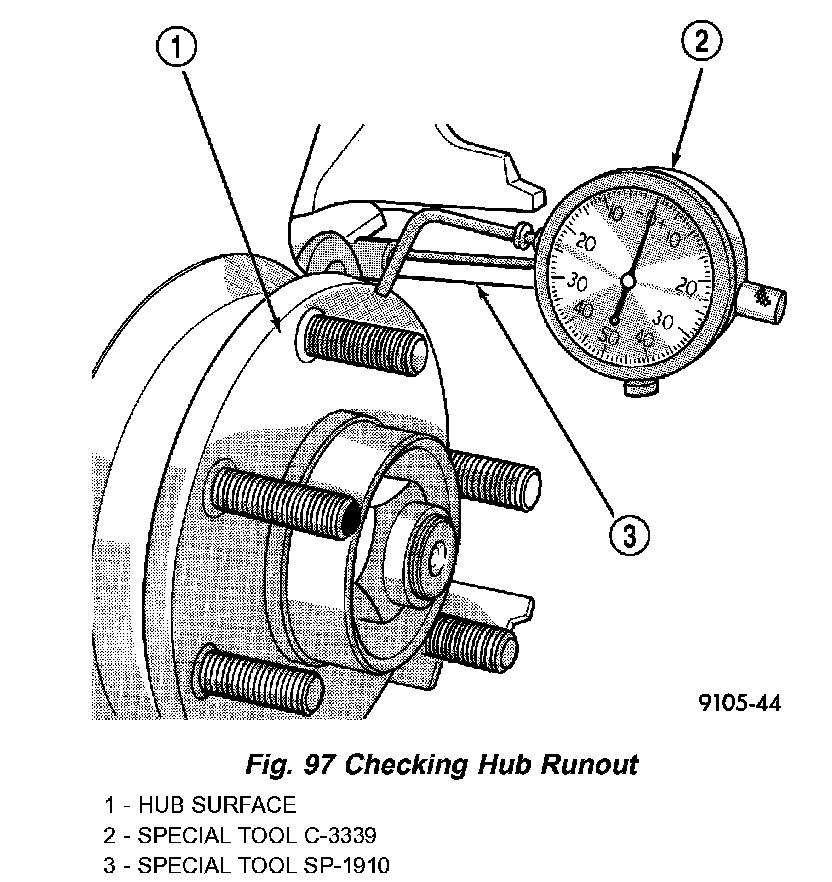 On-vehicle rotor runout is the combination of the individual runout of the hub face and the runout of the rotor. (The hub and rotor runouts are separable). To measure rotor runout on the vehicle, first remove the tire and wheel assembly. Reinstall the wheel mounting nuts on the studs, tightening the rotor to the hub. Mount the Dial Indicator, Special Tool C-3339, with Mounting Adapter, Special Tool SP1910 on steering arm. The dial indicator plunger should contact braking surface of rotor approximately ten millimeters from edge of rotor. Check lateral runout on both sides of the rotor, marking the low and high spots on both. Runout limits can be found in the specification table.