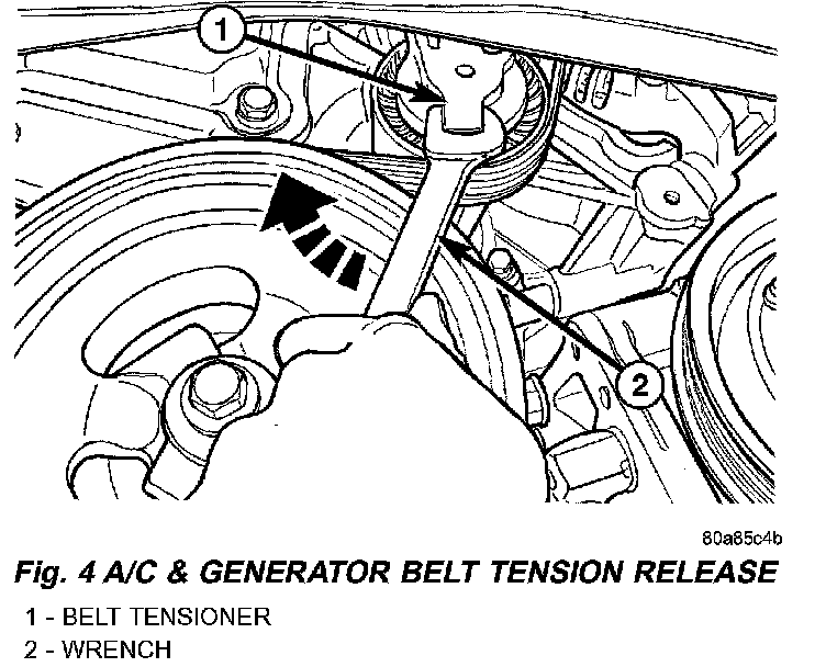 2. Rotate belt tensioner clockwise until belt can be installed onto the crankshaft pulley (Fig. 4). Slowly release belt tensioner.