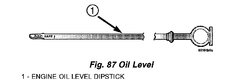 Checking the oil while the vehicle is on level ground will improve the accuracy of the oil level reading. Remove dipstick and observe oil level. Add oil only when the level is at or below the ADD mark (Fig. 87).