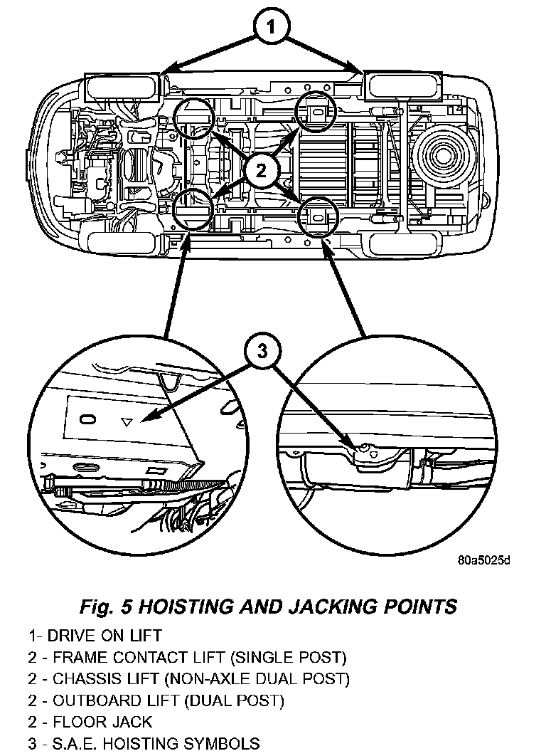 STANDARD PROCEDURE - HOISTINGRefer to Owner's Manual provided with vehicle for proper emergency jacking procedures.