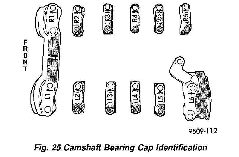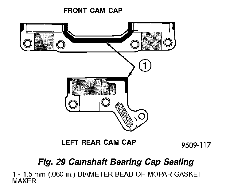 4. Apply Mopar Gasket Maker to camshaft bearing caps No. 1 and Left No. 6 (Fig. 29). Install bearing caps and tighten M8 fasteners to 28 Nm (250 in. lbs.).