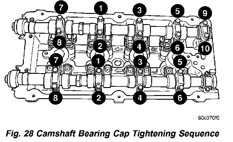 2. Tighten M6 fasteners on Left camshaft bearing caps No. 2 - 5 to 12 Nm (105 in. lbs.) in sequence shown in (Fig. 28).