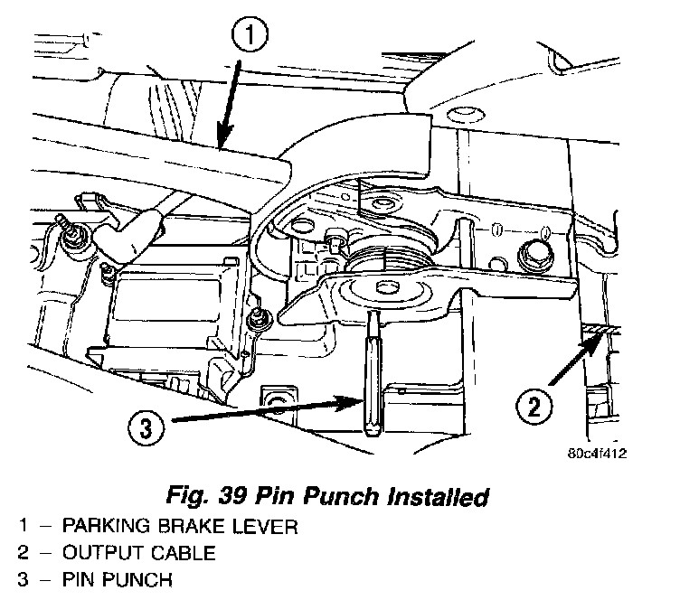 9. Grasp the parking brake lever cutout cable by hand and pull upward. Continue pulling cable until an appropriate pin punch (drill bit or locking pin) can be inserted sufficiently through hole in left side of the lever mounting bracket. This will lock the barking brake automatic adjustment mechanism in place and take tension off the parking brake cables. Slowly release the output cable. There should not be slack in the cables.