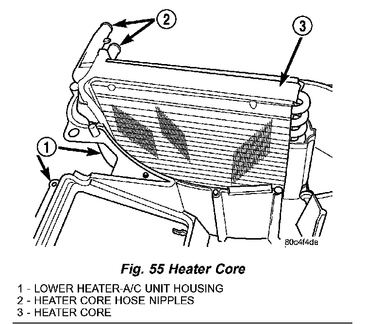 The heater core is located in the heater-A/C unit housing, under the instrument panel. It is a heat exchanger made of rows of tubes and fins. One end of the core is fitted with a molded plastic tank that includes the integral heater core hose nipples.