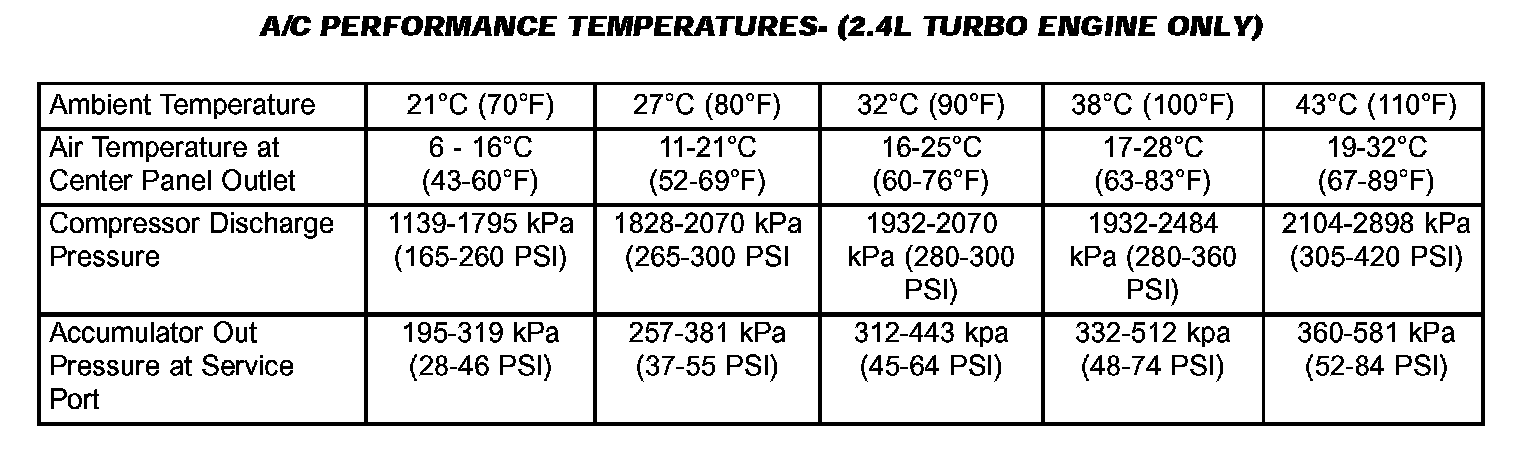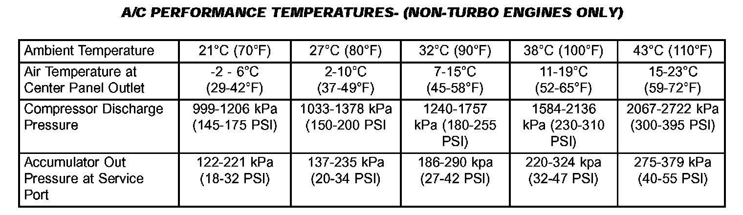6. With the A/C clutch engaged, compare the discharge air temperature to the A/C Performance Temperatures charts.
