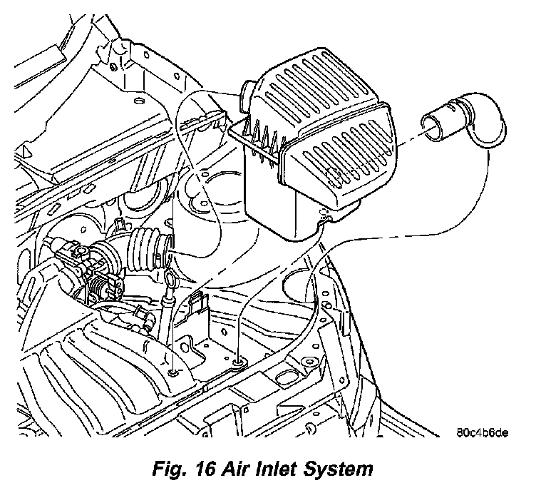 The air cleaner housing attaches to the inner fender in front of the driver's side strut tower (Fig. 16). An ambient air duct supplies underhood air for the engine. It attaches to the lower air cleaner box.