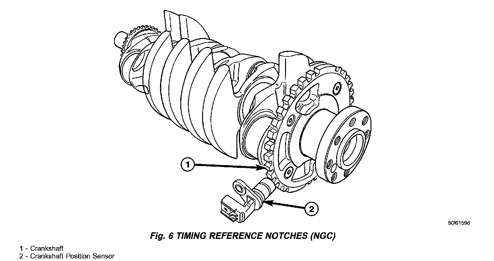 The Hall-effect sensor contains a powerful magnet. As the magnetic field passes over the dense portion of the counterweight, the 5-Volt signal is pulled to ground (0.3 volts) through a transistor in the sensor. When the magnetic field passes over the notches in the crankshaft counterweight, the magnetic field turns off the transistor in the sensor, causing the PCM to register the 5-volt signal. The PCM identifies crankshaft position by registering the change from 5 to 0 volts, as signaled from the Crankshaft Position sensor.