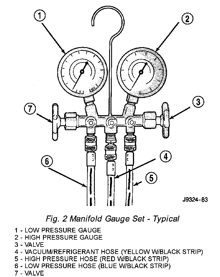 A R-134a gauge set must be used in conjunction with the charging/recovery/recycling device. The service hoses on the gauge set should have automatic back flow valves at the service port connector ends. This will prevent refrigerant R-134a from being released into the atmosphere.