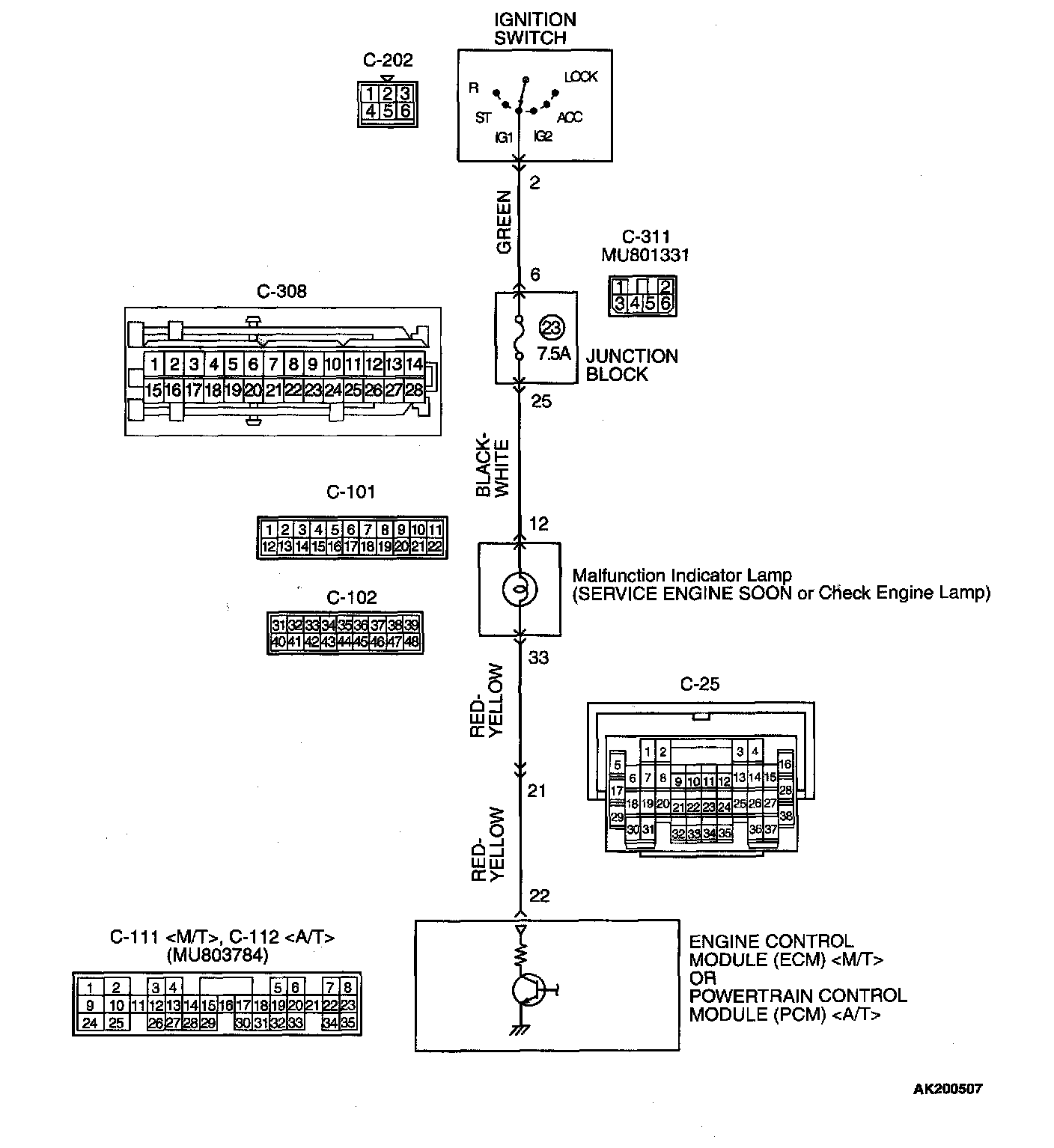 INSPECTION PROCEDURE 3: The Malfunction Indicator Lamp (SERVICE ENGINE SOON or Check Engine Lamp) Does Not Illuminate Right after the Ignition Switch Is Turned to the "ON" PositionMalfunction Indicator Lamp Circuit: