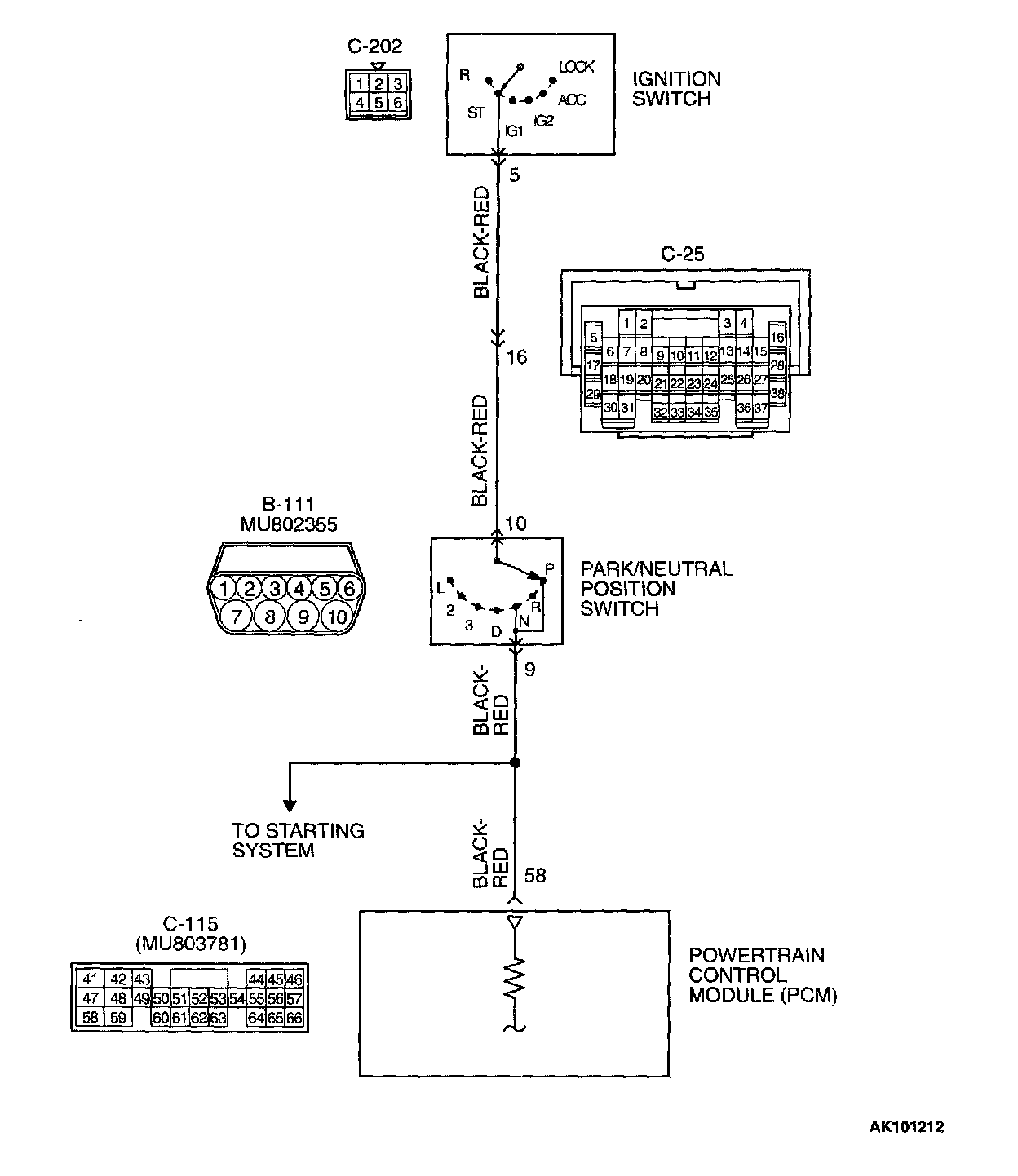 - If the selector lever is moved to "P" or "N" range and the ignition switch is turned to "START" position, battery positive voltage is supplied to PCM (terminal No.58) through the ignition switch and park/neutral position switch. Because of this, the PCM detects that the engine is cranking.