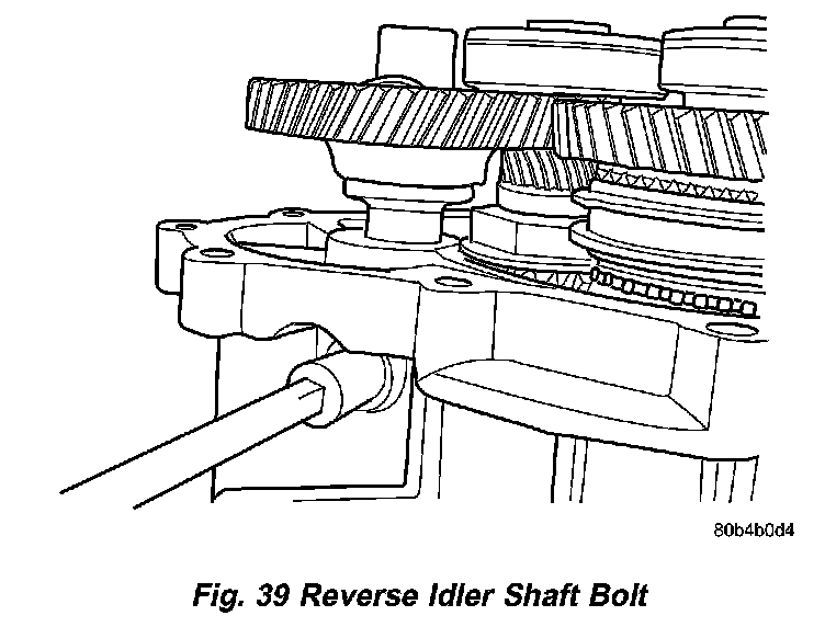 16. Remove reverse idler bolt (Fig. 39). Remove reverse idler gear, washers, and shaft upon geartrain removal.