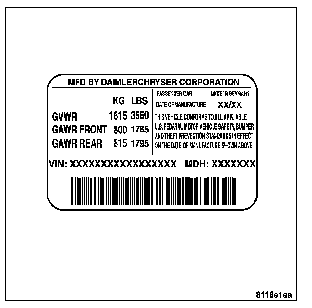 A vehicle safety certification label is attached to the rear surface of the driver's door. This label indicates date of manufacture(month and year), Gross Vehicle Weight Rating (GVWR), Gross Axle Weight Rating (GAWR) front, Gross Axle Weight Rating (GAWR) rear and the Vehicle Identification Number (VIN). The Month, Day and Hour of manufacture is also included.