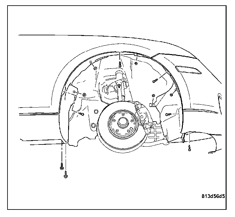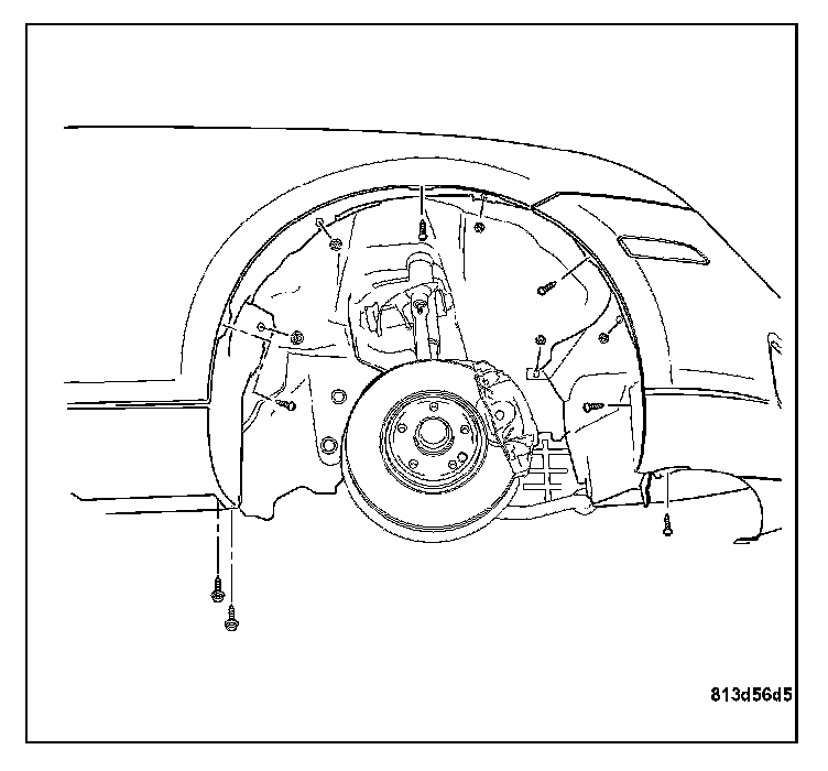 3. Install the five plastic retainer nuts and the five retainer screws from the wheelhouse splash shield.