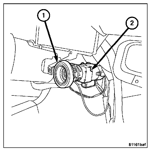 3. Pull to remove the sentry key antenna ring (1) from the ignition switch key cylinder (2).